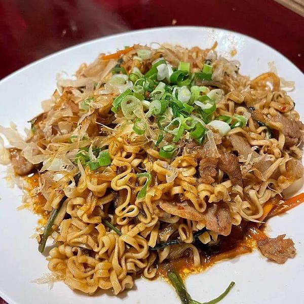 酒聚店家的炒泡麵,煮出來的麵條,Q軟不爛,配上特醬汁、蔬菜與肉片,入口後,鹹香豐富,好吃